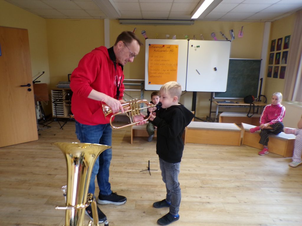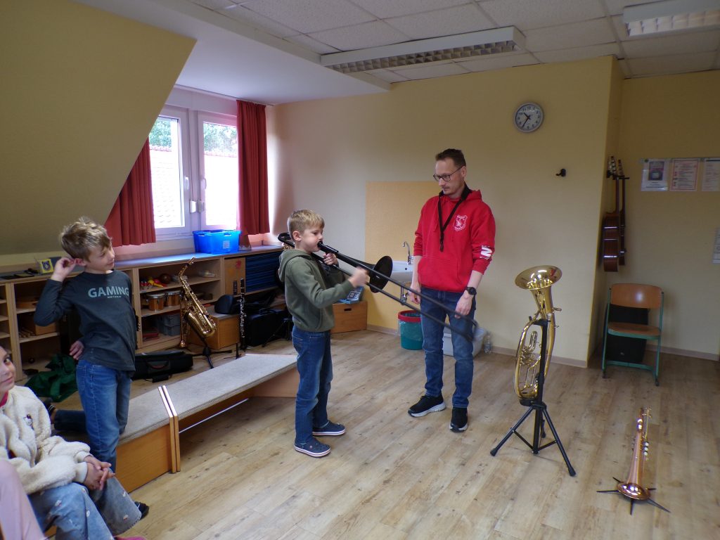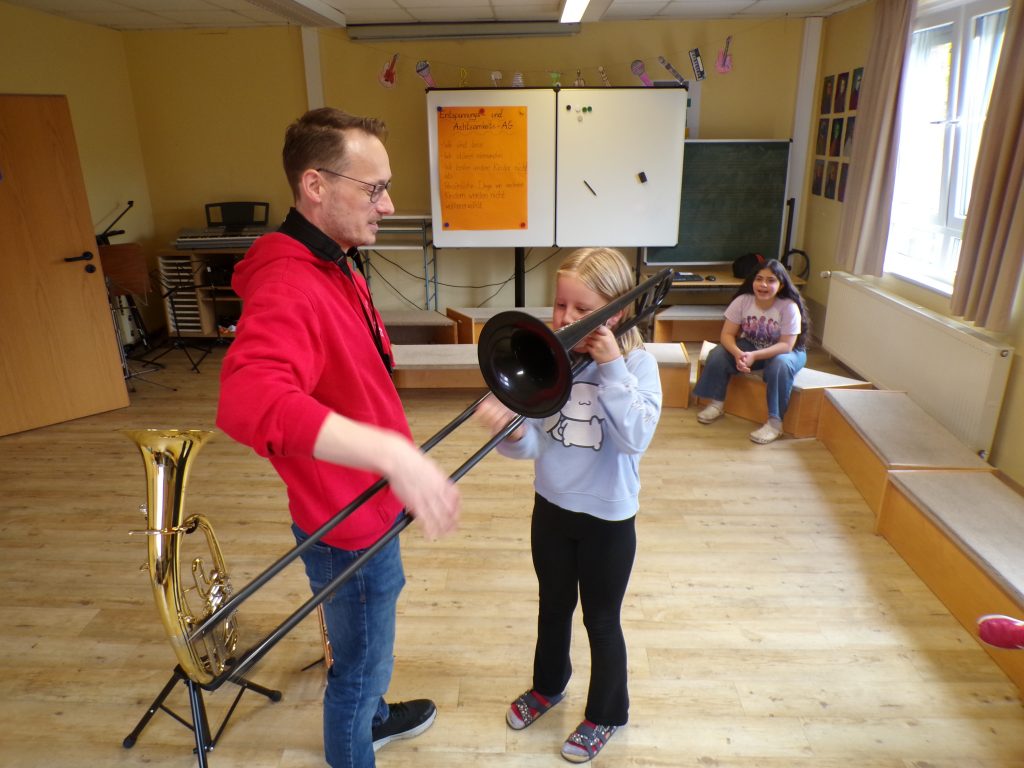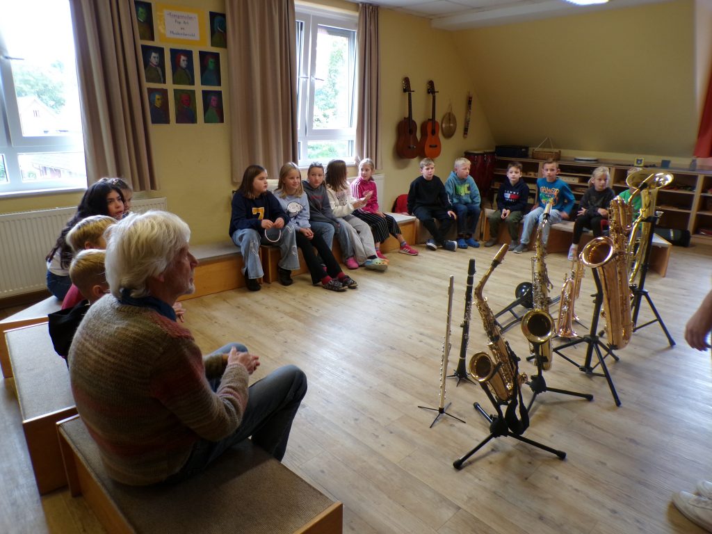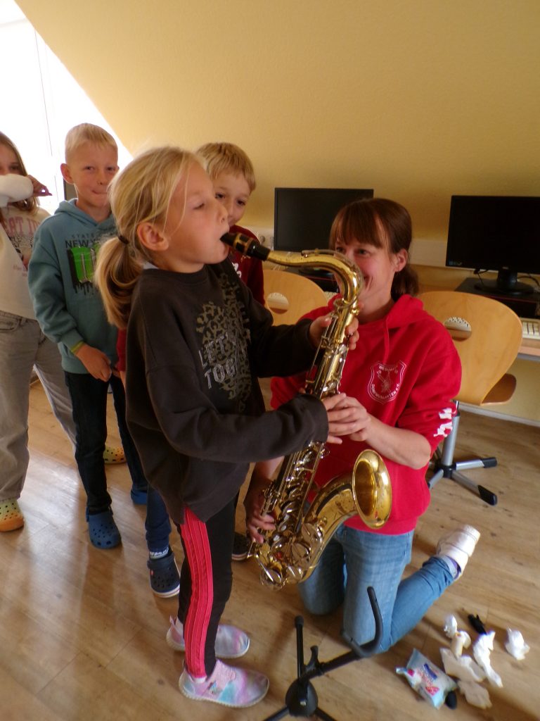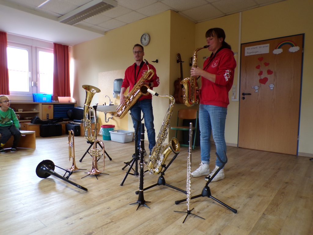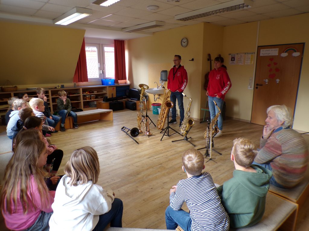 Am Freitag, den 26.09. bekamen die Klassen 3 Besuch von den Wesuweer Dorfmusikanten. Unter der Anleitung von Herrn Lübbers und Frau Meyer durften die Kinder Posaune, Saxophon, Querflöte und Co. aus der Nähe betrachten, anhören und im Anschluss auch selbst ausprobieren. Was für eine tolle Gelegenheit!