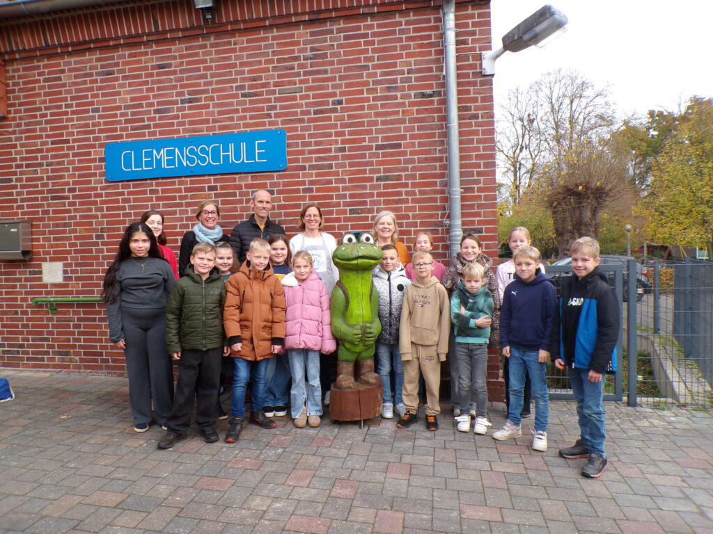 Neben den Landfrauen, hatten wir dieses Jahr aber noch weiteren Besuch: Judith Uthmann-Tattermusch und ihr Team haben zusammen mit uns das Maskottchen MOORex begrüßt. Es steht im Eingangsbereich der Schule und erinnert uns ab jetzt täglich daran, dass wir die Natur direkt vor der Haustür haben und sie nur darauf wartet von uns entdeckt zu werden.